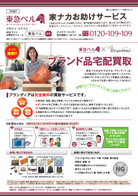 株式会社デファクトスタンダード(本社:東京都大田区、代表取締役社長:尾嶋崇遠)が運営するブランド品宅配買取サービス「ブランディア」は、東京急行電鉄株式会社(本社:東京都渋谷区、取締役社長:野本弘文)が運営するホーム・コンビニエンスサービス 「東急ベル」(以下、東急ベル)にて「ブランド品宅配買取サービス」の提供を2014年5月1日より開始いたしました。