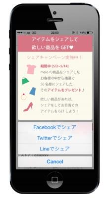meloでは、アプリ内の商品ページのシェアボタン(画面右上の(ハード)型のアイコン)から、気になったアイテムを各SNS(Facebook・Twitter・LINE)に、簡単に投稿する事ができます。
