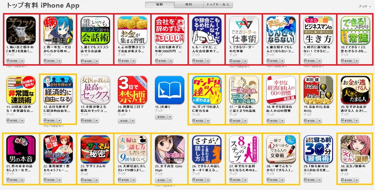 iPhone・iPad電子書籍アプリ1位「怖いほど相手の「本質」を見抜くブラック心理学」、2位「株一年生~ゼロからわかる株の教科書~」、3位「誰とでもスラスラ話せる会話術、以下7作品がブックランキングの1~10位まで独占!また、ブックランキングベスト30位以内に25作品がランクイン!!