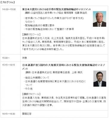 東日本大震災では、あまりに広域かつ大量の被災者が発生したため、従前の災害とは異なる大変な苦労や創意工夫があったそうです。本セミナーでは、岩手県の物資輸送を成功裡に導いた岩手県トラック協会の佐藤耕造専務理事と日本通運の上條靖部長をお招きして、緊急支援物資輸送を通じた大災害時における業務マネジメントについてお話しいただきます。