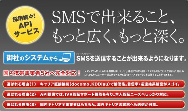 「メディアSMS」は、携帯電話番号が判ればメッセージの送れるSMS(ショートメッセーシ゛)の法人向けサービスです。日本におけるSMS送信サービスとして、品質と低コストを両立させたサービスを実現します。特にメディアSMS・Connect(API)は、クライアントのシステム(外部システム)からのSMS送信を可能にします。送信先携帯電話番号やSMS原稿等を、http通信(SSL)により、パラメータとしてリクエストしていただくことで、例えば顧客管理システムや予約システム等からSMS送信することが可能になります。もちろんAPIだけでなく、汎用的な送信管理画面やIVRと組み合わせたサービスも用意しています。