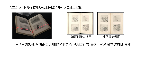 特にV字ポジションでは、平面補正機能の実装により本を180°開かなくても撮影が可能になるため、古書、貴重書などへの負荷を最小限にしたスキャンを行うことができます。