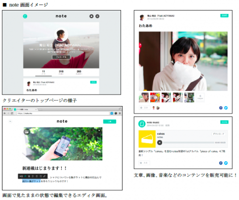 note(http://note.mu)は、文章、写真、イラスト、音楽、映像などの作品を投稿して、クリエイターとユーザーをつなぐことができる、まったく新しいタイプのウェブサービスです。