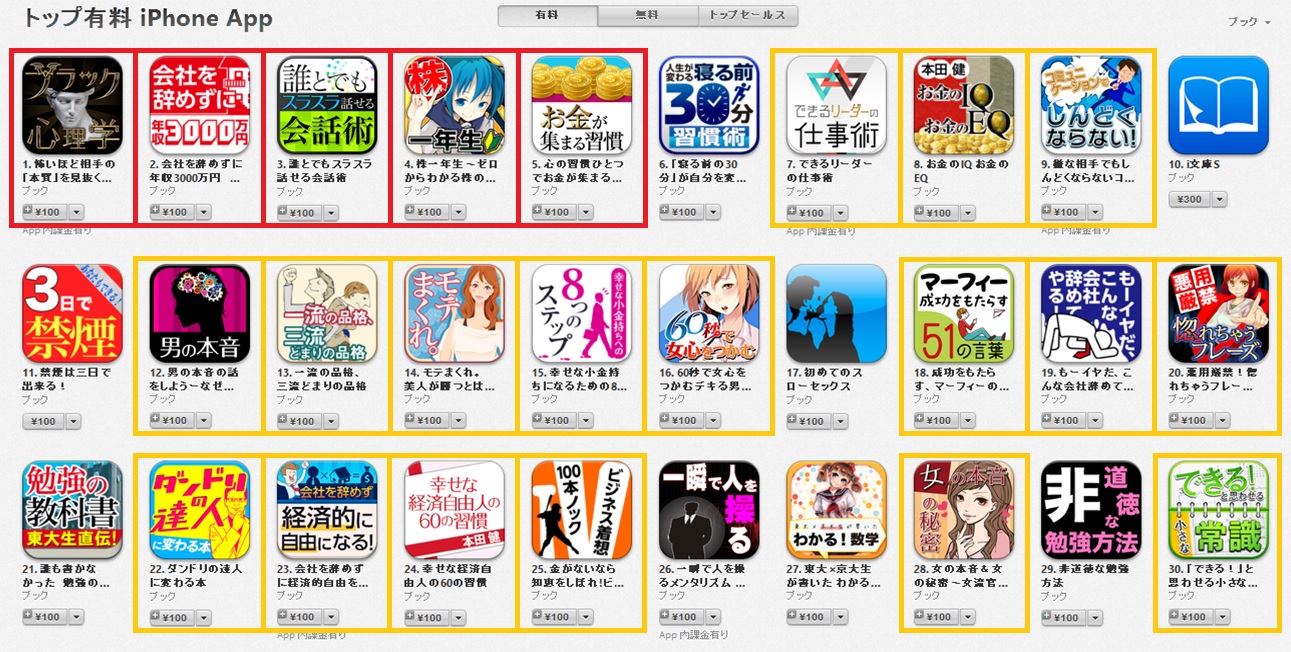 iPhone・iPad電子書籍アプリ1位「怖いほど相手の「本質」を見抜くブラック心理学」、2位「会社を辞めずに年収3000万円」、3位「誰とでもスラスラ話せる会話術、以下2作品がブックランキングの1~5位まで独占!また、ブックランキングベスト30位以内に22作品がランクイン!!