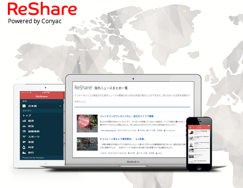 ReShareとはオンライン上に発信された海外ニュースを、あらゆる言語に精通しているConyacユーザーが、元の記事の言語と違う言語にまとめて紹介するサービスです。ユーザーは自分で読んでいて面白いと思った記事を違う言語にまとめて発信することが出来ます。アプリのリリースにより、作成された ReShare を iOS 端末に加え Android端末でも読むことが出来るようになりました。