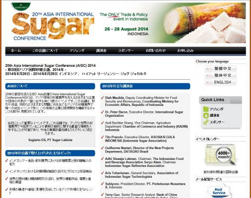 株式会社グローバル インフォメーションでは、皆様の利便性を図る為に、日本語、韓国語、中国語で「20th Asia International Sugar Conference (AISC) 2014-第20回アジア国際砂糖会議 2014年」の情報を提供するとともに、会議の参加のお申し込みを承っております。