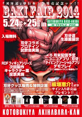 株式会社壽屋(本社:東京都立川市曙町/ 代表:清水一行)は、2014年5月24日(土)・5月25日(日)の2日間、コトブキヤ秋葉原館(東京都千代田区外神田1-8-8)にて「週刊少年チャンピオン」にて連載中の人気作品『刃牙道』のイベント「BAKI FAIR 2014」の開催を予定しています。