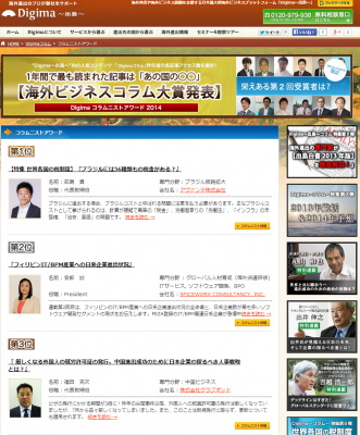 昨年度の第一回の発表に続き、今年度も海外ビジネスコラムの各記事アクセス数を集計。2013年3月~2013年4月の期間で閲覧されたコラム記事のランキングを『Digima~出島~ コラムニストアワード2014・海外ビジネスコラム大賞』として発表いたしました。