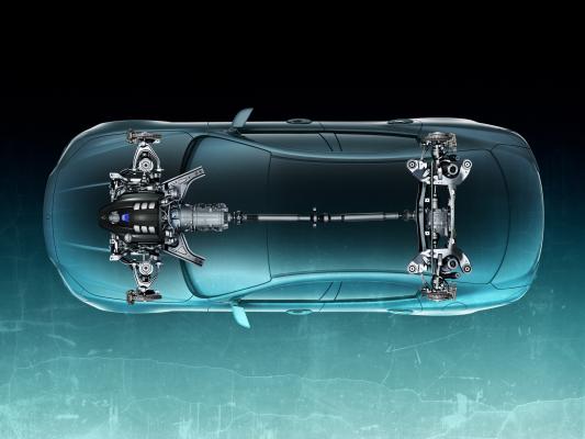 トランスミッションは、ZF社と共同開発のAT8-HP70型8速オートマチック、ホイールは18インチアロイホイールを標準装備。ブレーキは小型・軽量化を図り、フロントは4個のピストン一体型のキャリパーが、リアはフローティングキャリパーがベンチレーテッド・ディスク(前: 345x 28mm/後: 320x 22mm)を制御します。