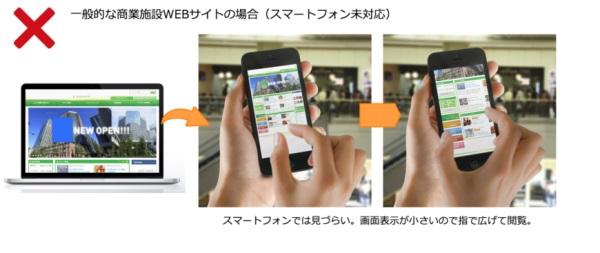 まずインバウンド対策に必要なのは、WEBサイトのオールデバイス対応(スマートフォン、タブレット)です。訪日旅行者が街中では特にスマートフォンを使って情報収集を行っています。PCむけに作られた既存WEBでは、スマートフォンでの閲覧は小さく表示されるので見づらくなります。つまり、商業施設、百貨店・実店舗様WEBサイトのオールデバイス、特にスマートフォン対応は必須条件となります。