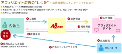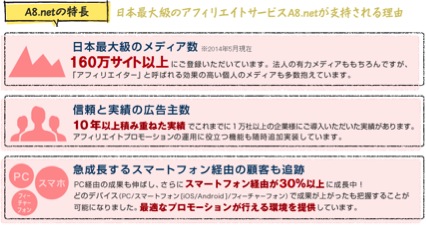 A8.netは、成功報酬型広告の一つであるアフィリエイト広告サービスで日本最大級の規模となっており、圧倒的な提携メディア(※1)数と、マーケティングノウハウを有しています。