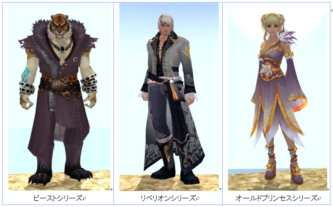 本日のアップデートから、ゲーム内モール「乾坤袋」に妖獣族のみ着用できる特別な新ファッションアイテム「ビーストシリーズ」を始め、全種族着用できる新ファッションアイテム「リベリオンシリーズ」、「オールドプリンセスシリーズ」や、新クジアイテム「双星BOX」の販売を開始しました。