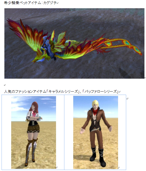 「双星BOX」では、希少騎乗ペットアイテム「カグヅチ」や、人気のファッションアイテム「バッファローシリーズ」、「キャラメルシリーズ」など、注目品が盛りだくさん!「双星BOX」は次期アップデートまでの期間限定となりますので、お見逃しなく!
