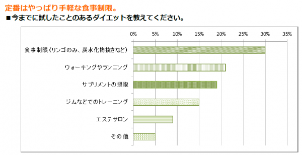中には話題になった「ロングブレスダイエット」「レコーディングダイエット」「カーヴィーダンス」など様々なダイエット法を試したという意見や、ダイエット食学習会に参加したという意識の高い方もいらっしゃいました。