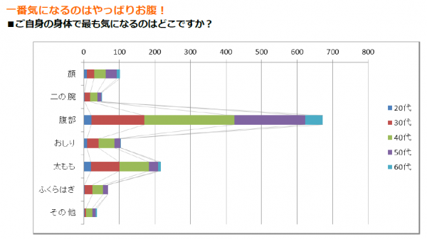 年代別にみると、20代ではお腹と太ももがほぼ同数だったのに対し、30代以降になると圧倒的にお腹を気にする方が多くなっており、年齢によって気になる部位が変化することをうかがわせる結果となりました。