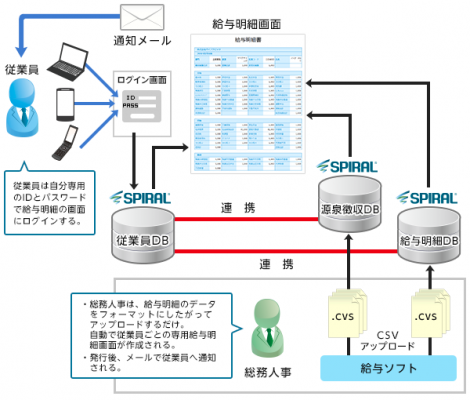 「スパイラル(R)」の給与明細電子化ソリューションは、給与明細の発行を大幅に業務効率化できるとご好評いただいております。人事ご担当者様が、お使いの給与ソフトから給与情報を「スパイラル(R)」にアップロードするだけで明細発行作業は完了し、従業員ごとに専用の給与明細画面が自動生成されます。日時指定した明細発行お知らせメール(自動配信)で通知し、従業員の方は、PCや携帯電話から個別のID・パスワードでログインしていつでも安全に給与明細を閲覧できます。また、給与明細書の郵送コストや紙資源消費をなくすほか、紛失や誤発送による情報漏洩リスクを低減します。