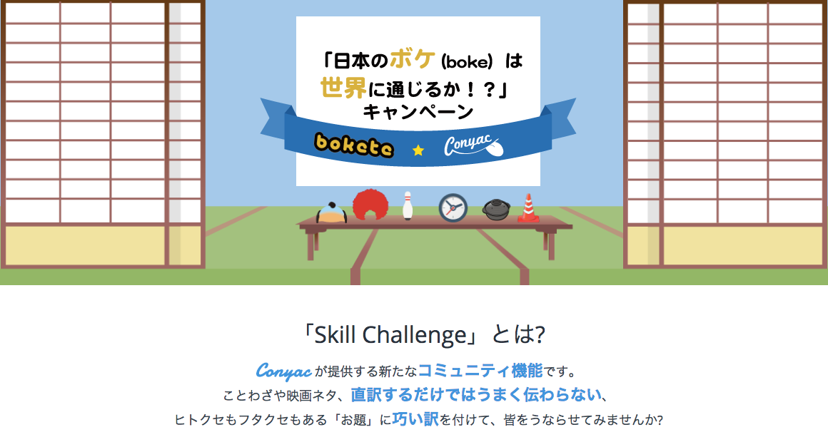 株式会社エニドア(本社:東京都千代田区、代表:山田尚貴)は2014年5月14日、Conyacの語学学習者向けのコミュニティ機能として「Skill Challenge(読み:スキルチャレンジ)」をリリースしました。また、お笑いウェブサービス「ボケて」を運営する株式会社オモロキ様より「ボケて」の人気コンテンツを、Skill Challengeのお題として提供していただきます。