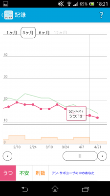 ココロの状態推移をグラフで確認できるほか、お薬手帳とも連動し服用剤数の変化も同時に確認できます。また全国のアン-サポ・ユーザーと自分の状態を比較することもできます。