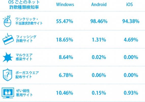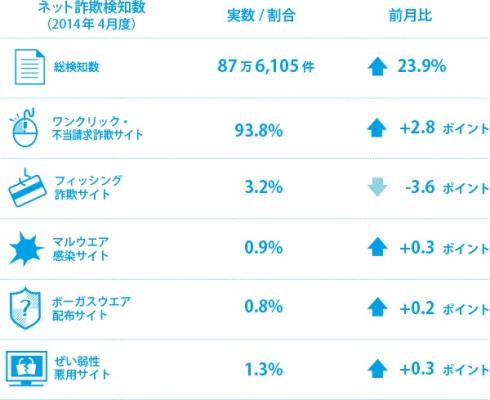 ワンクリック・不当請求詐欺サイトは93.8%(前月比2.8ポイント増)、フィッシング詐欺サイトは3.2%(前月比3.6ポイント減)、マルウエア感染サイトは0.9%(前月比0.3ポイント増)、ボーガスウエア配布サイトは0.8%(前月比0.2ポイント増)、ぜい弱性悪用サイトは1.3%(前月比0.3ポイント増)でした。