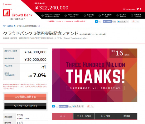 クラウドバンクは応募金額3億円突破を記念して、特別利回りの商品をリリース。営業者報酬の一部をユーザーに還元することで、通常のファンドよりも高い利回りで提供を行います。