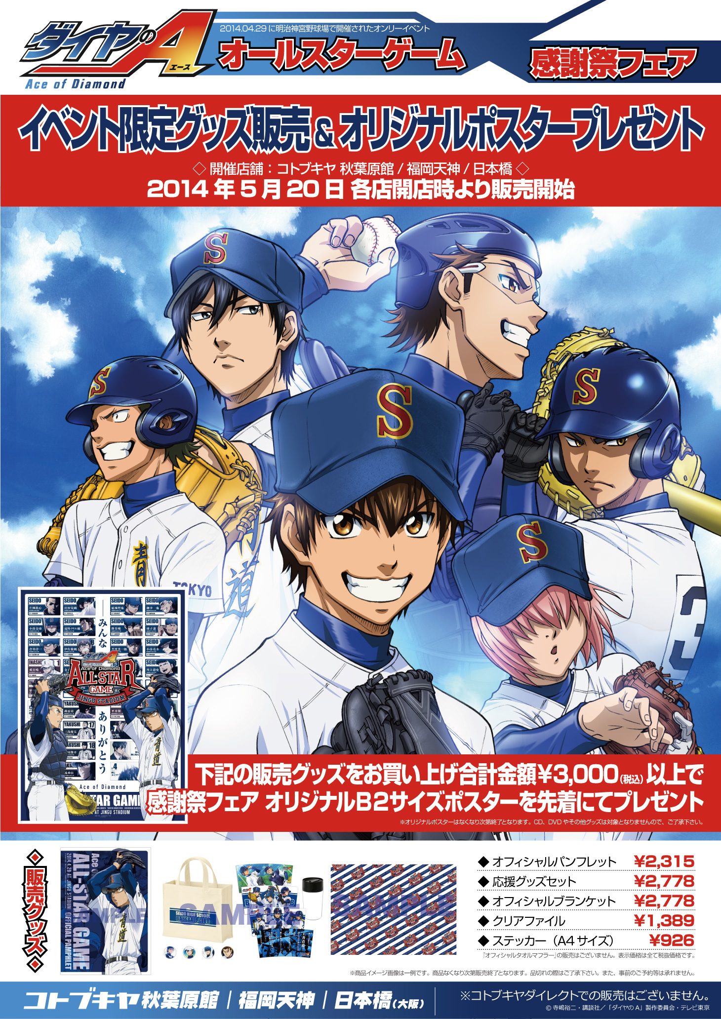 2014年4月29日に明治神宮野球場にて開催された「ダイヤのA」オンリーイベント「オールスターゲーム」、こちらで販売されたイベントグッズであるパンフレットや応援グッズセットなどの商品取扱いを開始。商品は無くなり次第終了となりますのでご注意下さい。