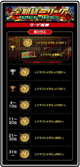 本リーグでの順位に応じて、「ドラゴンメダル」を報酬として贈呈いたします。順位によっては大量GETのチャンスです!
