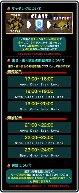 本リーグでは1~9期の全期全チームが、チーム総合力を基準にS~Lの13クラスに分かれて戦います。各クラスは、お互いの戦闘力が比較的近いチーム同士でマッチングされるため、いつものリーグ戦以上に熱い戦いが楽しめます。また、優勝チームはクラスごとに決定するため、今まで惜しくもリーグ戦優勝を逃してしまっていた騎士団も優勝の可能性が広がります。