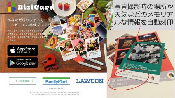 『BiziCard for iPhone』を利用して写真撮影を行うことで、撮影時の「場所」「天気」「日時」などが自動刻印されたL判2L判のフォトカードが作成されます。「場所」を編集することで利用した施設名などを刻印することもできるため、写真撮影時の記憶をたどるアシストにもなります。作成されたフォトカードはシャープの「コンテンツプリントサービス」が提供されているファミリーマート及びLAWSON店舗においてプリントアウト可能です。 『BiziCard for iPhone』アプリの利用ユーザには1GBのストレージ容量が付与され、作成したコンテンツは容量の範囲内で保存されます。個々のコンテンツ(Card)には、コンビニの「コンテンツプリントサービス」を利用してプリントアウトするための「カードプリント番号」が発行されます。キャビネットにコンテンツ(Card)が保存されている限り「カードプリント番号」は有効でメールやLINEなどのメッセージツールを用いて繋がりのある人に知らせることで、自分以外の親しい人にもコンビニでコンテンツ(Card)をプリントアウトしていただくことが可能です。