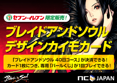 PCオンラインゲームのサービス、運営をしているエヌ・シー・ジャパン株式会社(本社:東京都渋谷区、代表取締役:金 澤憲(キム テクホン)以下、エヌシージャパン)は、本日、超大型オンラインRPG『ブレイドアンドソウル』の日本正式サービスを迎えます。これに合わせて、全国のセブン-イレブン店舗で展開している『プリペイドカード専用什器』に「ブレイドアンドソウルデザイン カイモカード」(以下、本商品)が登場いたしました。