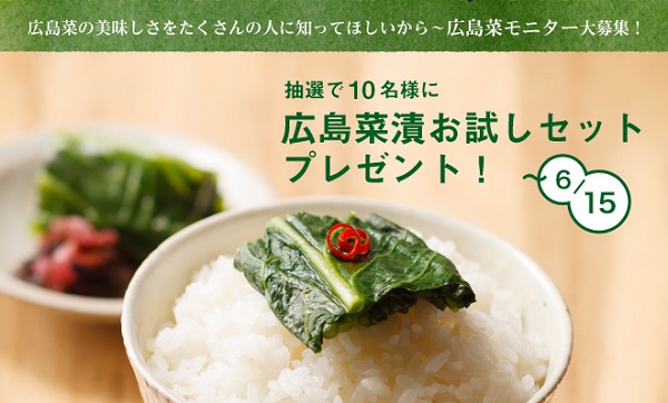 日本三大漬菜の広島菜漬の製造・販売を行う、株式会社 山豊(本社:広島市/代表取締役:山本 千曲)では、ネット通販サイト「山豊ネットショップ」にて、「広島菜漬お試しセット」(売価1,500円)を試食後、感想や美味しい食べ方などをブログに書く又はメールで感想を送っていただける方を対象に、6月15日(日)まで広島菜モニター10名様を募集します。