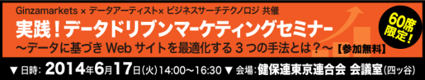 ビジネスサーチテクノロジ株式会社(本社:東京都千代田区、代表取締役CEO:城野洋一)は、データアーティスト株式会社(本社:東京都渋谷区、代表取締役社長:山本覚)、Ginzamarkets株式会社(本社:東京都港区、代表取締役社長:レイ・グリセルフーバー)と共同で、「実践!データドリブンマーケティングセミナー~データに基づきWebサイトを最適化する3つの手法とは?~」を、2014年6月17日(火)に開催いたします。