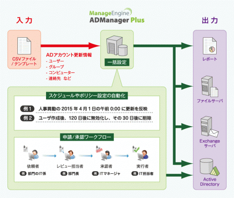 図1:ADManager Plus による一括設定・自動化・ワークフローイメージ