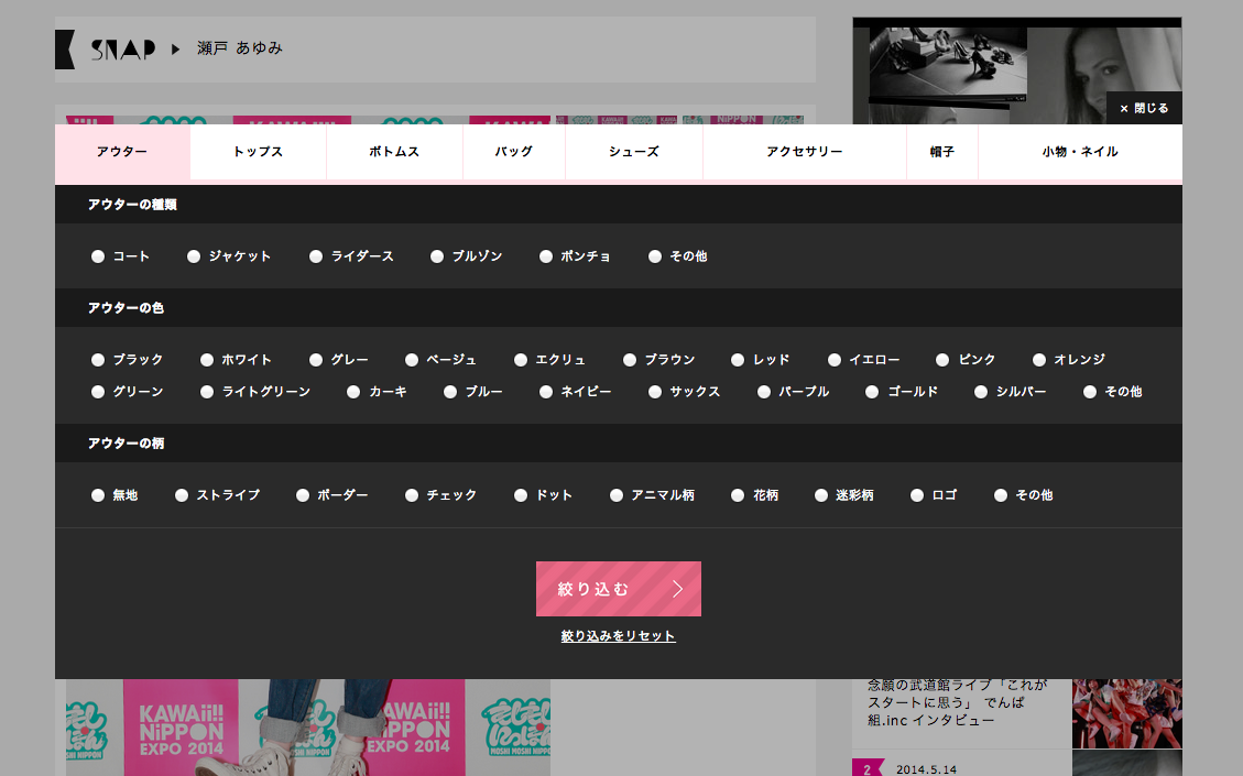 サイトスタート時からのコンテンツであるSNAPは、アヴァンギャルドやガーリーなど10以上のスタイルカテゴリーやコーディネートに密接した重要な要素となるヘアスタイルのカテゴリーなど、一つのSNAP記事をさまざまにカテゴライズ致しました。また、着用アイテムの絞り込み検索機能を追加。この検索機能の追加で、例えばライダースジャケットを着たSNAP一覧が表示可能になりました。