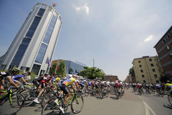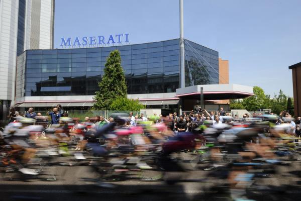 5月20日午後、カラフルなウエアに身を包んだ華やかな選手たちの一団は、第10ステージの起点である「ゼロキロ地点」が表示された、ヴィジオーネ・アックイ通りに面したマセラティ工場施設の正門前から一斉に出発しました。