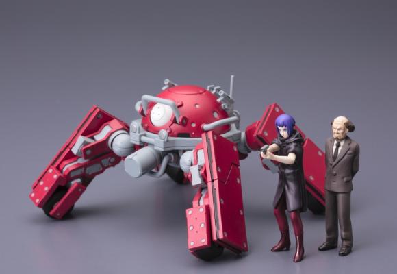 腕部は差し替えによってマニピュレーターの展開を、脚部は特徴的な可動ギミックで、人や車を飛び越えるシチュエーションも再現できます。アンカー発射装置は1門のタイプと3門のタイプが付属し、機体下面にはガトリングガンを取り付けることができます。また、付属品として[草薙素子・荒巻大輔・自走地雷]の未塗装組立式フィギュアも付いてくる満足度の高いキットとなっています。塗装派でない方も組み立てるだけで『攻殻機動隊ARISE』の世界をお楽しみ頂けます。