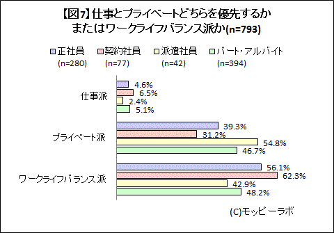 図表参照:【図7】仕事とプライベートのどちらを優先させるか、またはワークライフバランス派か(n=793/雇用形態別)
