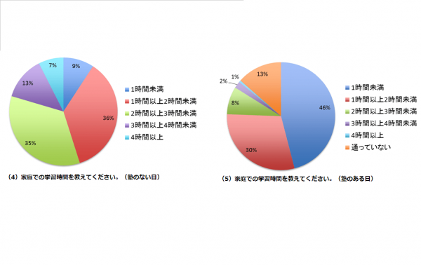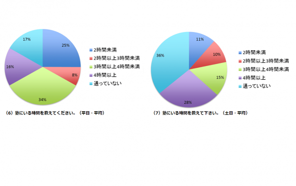 やはり平日とくらべると塾の滞在時間は長くなっています。「通っていない」を除くと、もっとも多い回答が「4時間以上」、これは特別講座や複数科目の授業、テストなどが行われていると推測されます。
