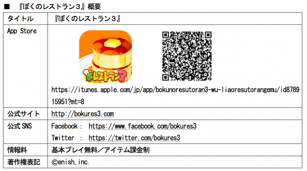 株式会社enish(本社:東京都港区、代表取締役社長:安徳 孝平、以下「エニッシュ」)は、今春リリース予定とご案内しておりましたネイティブアプリ『ぼくのレストラン3』の配信を2014年5月23日よりApp Store上で配信開始いたしました。