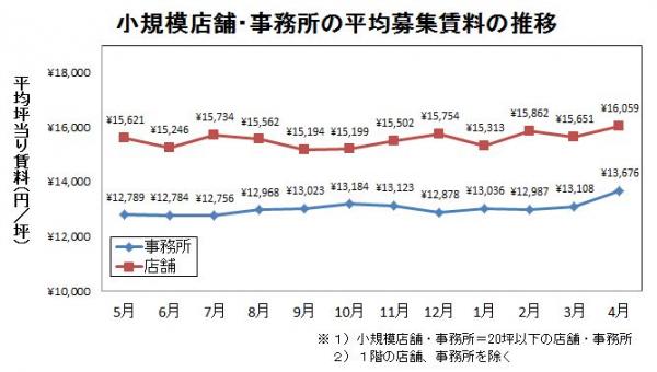 小規模店舗(20坪以下)の4月度平均募集賃料は、消費増税の影響で、4月に前月比2.6%上昇し、1.6万円台に入りました。