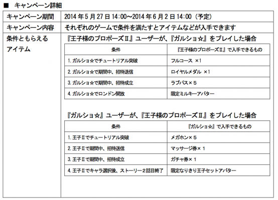 株式会社enish(本社:東京都港区、代表取締役社長:安徳 孝平、以下「エニッシュ」)が提供する ソーシャルゲーム『ガルショ☆』は、本日 2014 年 5 月 27 日(火)より、株式会社ボルテージ(本社: 東京都渋谷区、代表取締役社長:横田 晃洋)がソーシャル・ネットワーキング・サービス(SNS)「GREE」 で配信中の恋愛ソーシャルゲーム『王子様のプロポーズII』とのコラボキャンペーンを開始いたします。各種アイテム入手のチャンスとなりますので、ぜひ下記よりアクセスしてお楽しみ下さい。