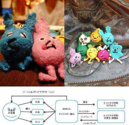 プロジェクト第1弾は、ネパール ヒマラヤ小学校「KOKEくんフェルトキーホルダー」プロジェクト。ヒマラヤ小学校では、卒業生や保護者が、手に職をつけ自立するための職業訓練を行っています。そこでコケから生まれた不思議な生き物「KOKEくん」((C)リプロモ)のキャラクターを提供し、フェルト細工のキーホルダーを制作してもらっています。