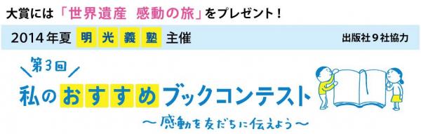個別指導塾「明光義塾」を全国展開する株式会社明光ネットワークジャパン(本社:東京都新宿区、代表取締役社長:渡邉 弘毅、東証第一部:4668)は、「明光義塾」主催「第3回 私のおすすめブックコンテスト」を2014年7月1日(火)より実施いたします。