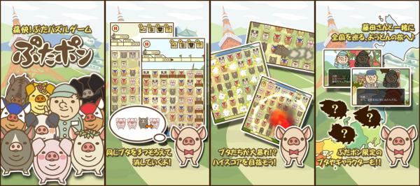 ぶたポン!では色んな種類のブタがパズルに。同じブタを3つつなげると連鎖開始!