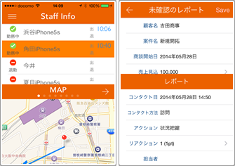 スマートフォンが持つ、ロケーションログ、タイムログなどの機能を活用して、企業の営業・業務(行動・勤怠・予算・実績・商談・経費・集金・顧客)の状況を即時に情報収集できるアプリとなっています。