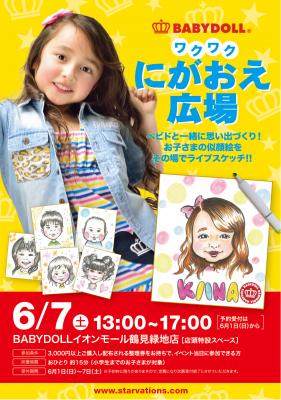 ベビー・キッズ服ブランドBABYDOLL(ベビードール)が、BABYDOLLイオンモール鶴見緑地店にて、お子様の似顔絵をライブスケッチしてプレゼントする[ワクワク! にがおえ広場]を6月7日(土)開催!