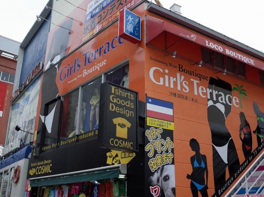 沖縄県那覇市国際通りのほぼ中心地スターバックス前の一等地にて、6月1日国内最大級の品揃えレディース水着ブティック「ガールズテラス」(TS fashion 株式会社直営)が堂々OPEN!!その名の通りオシャレ女子の為の専門ブティック!!沖縄にありそうでなかった店を実現!!なんと水着だけで約500種類以上~ その華やかさたるや女子なら誰もがテンションMAX間違い無し。外観はオレンジ色で女性の水着姿のシルエットの看板が大きくに描かれており国際通りでも一際異彩を放っております。