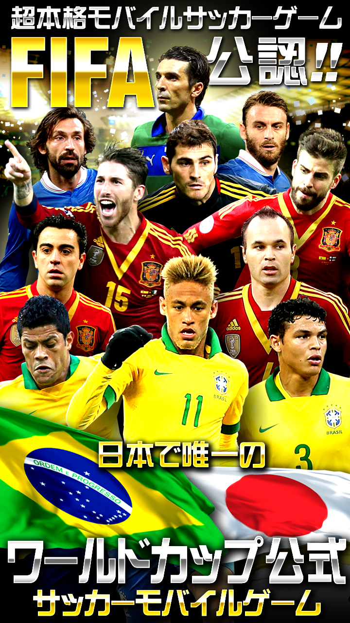 本作は、FIFAシリーズ初の日本のみなさまのためだけに完全にカスタマイズされたネイティブアプリゲームです(基本プレイ無料)。日本で唯一の2014 FIFA World Cup Brazilの公認モバイルサッカーシミュレーションゲームとして、2014 FIFA World Cup Brazilに出場する全32カ国の1,000人以上の各国代表選手の中から、実名・実写で自分だけのドリームチームをつくり、開催国ブラジルを舞台に試合に挑むことができます。