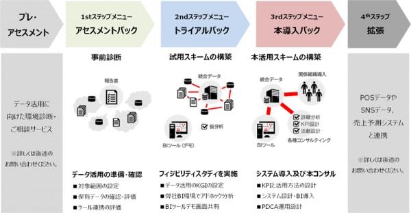 まずはスモールスタートで、データ資産の確認、環境評価(アセスメント)から始め、手ごたえ・成果に応じて、試用(トライアル)から本導入に進行するステップオーダー式を取り、ご検討いただきながら、進行するアプローチになります。