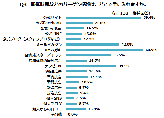 ■バーゲン情報の入手経路は「DMハガキ」「公式サイト」など公式情報がTOP