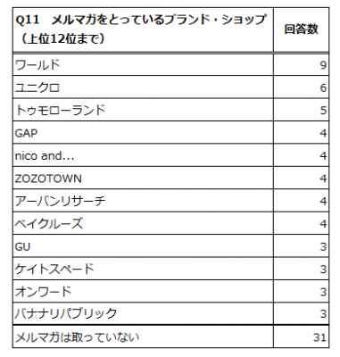 メールマガジンを取っているブランドは、好みにより異なるため回答がばらつきましたが、その中では「ワールド」に最も多く回答が集まりました。